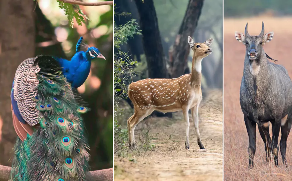 Spot leopards, deer, blue bulls, peacocks, and other wildlife in their natural habitat.